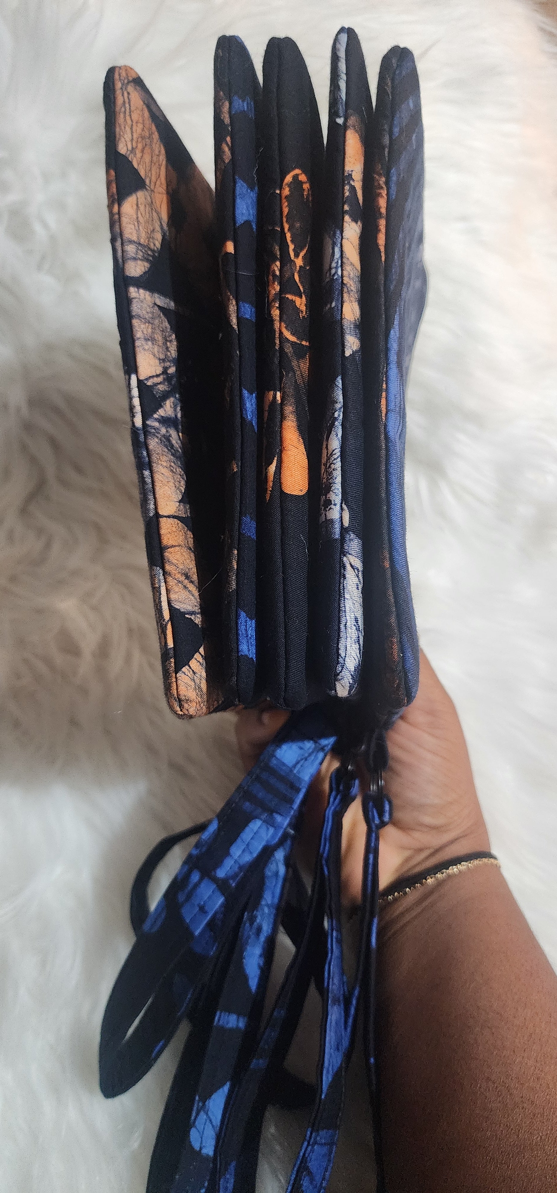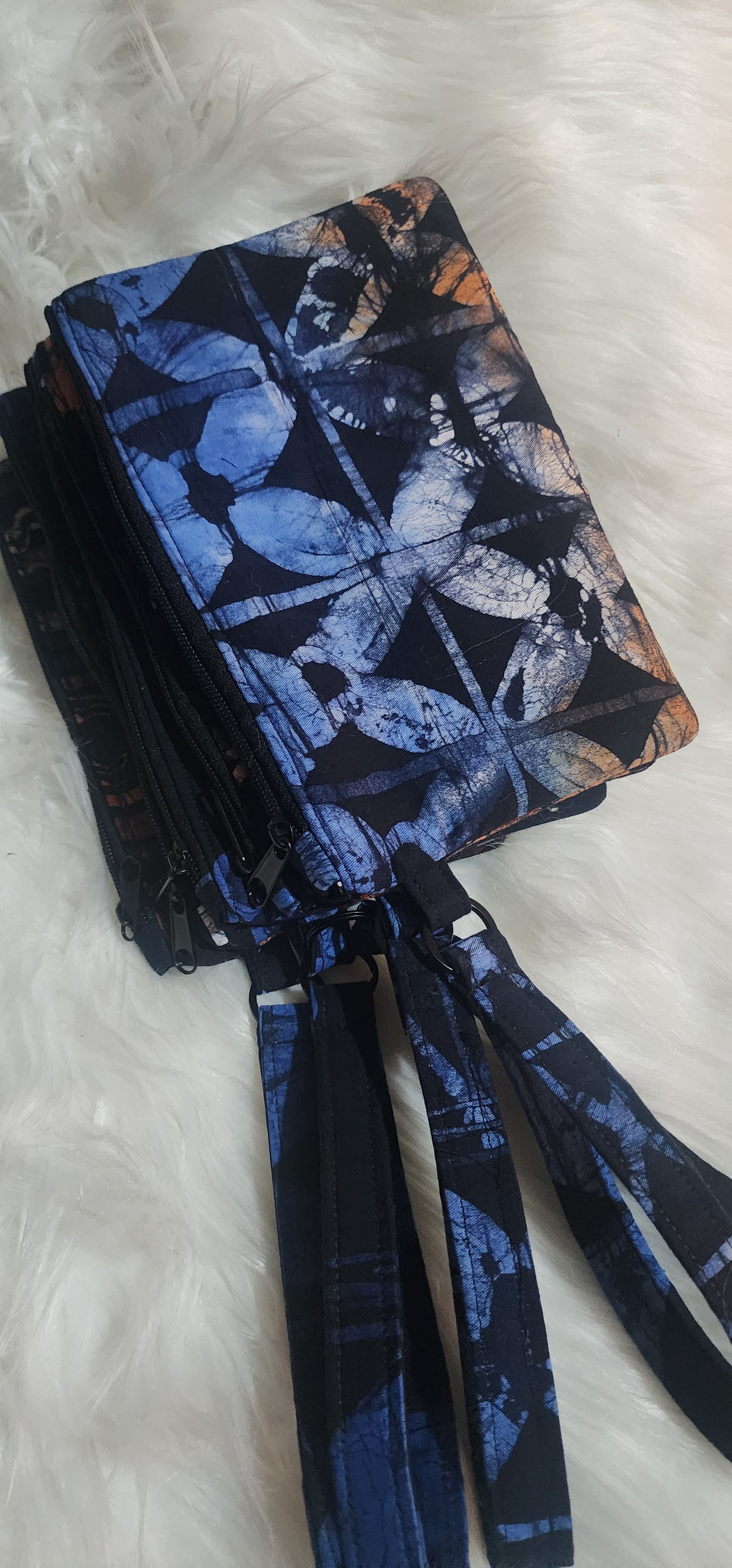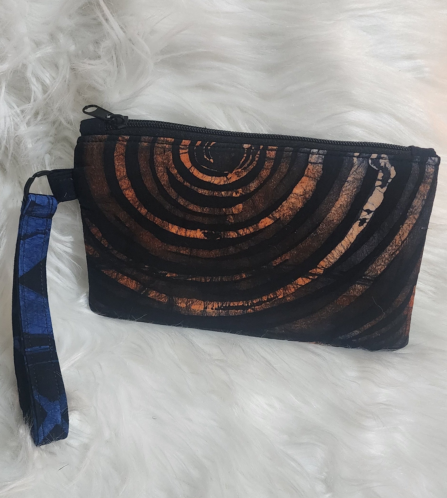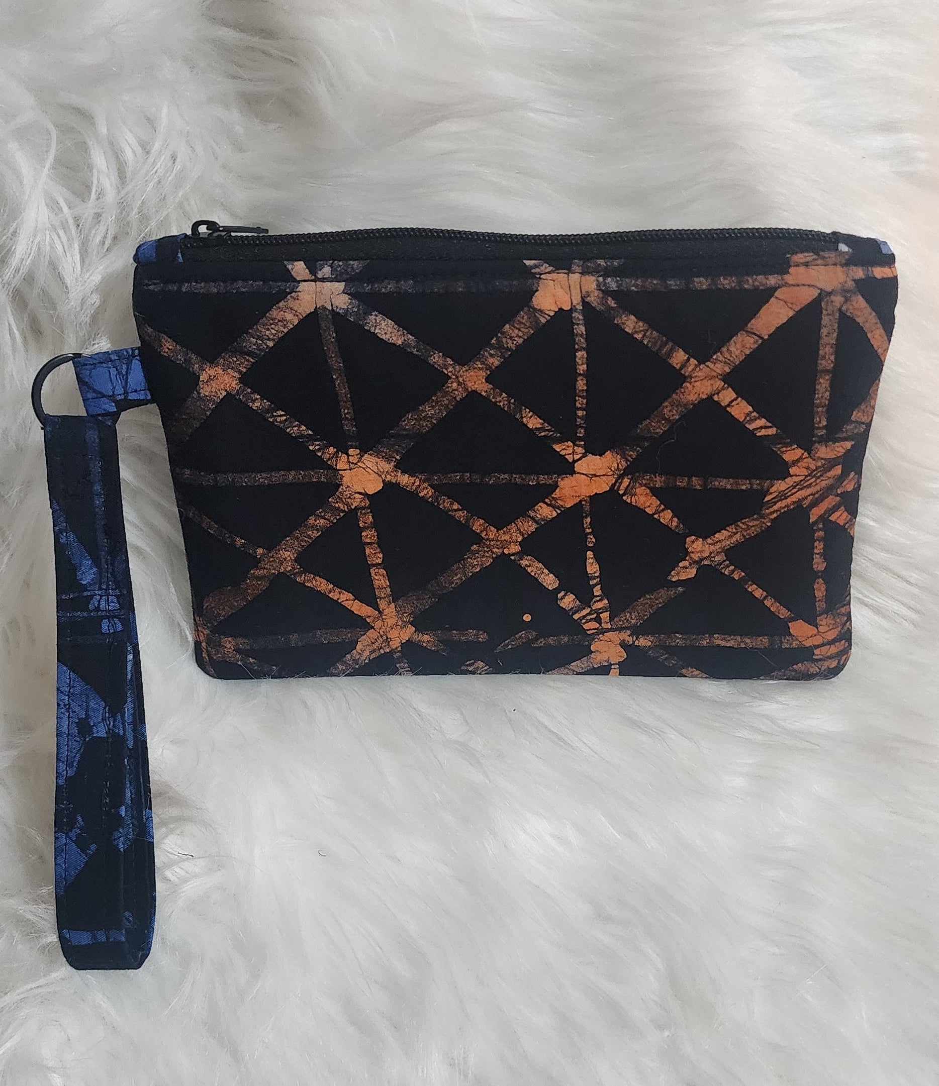 Handmade hand dyed adire batik wristlet in rich blue and orange tones. Lightweight, roomy, fully lined, and secured with zipper closure—perfect for carrying phone, cash, and essentials. A unique, culture-rich gift idea for the holidays.