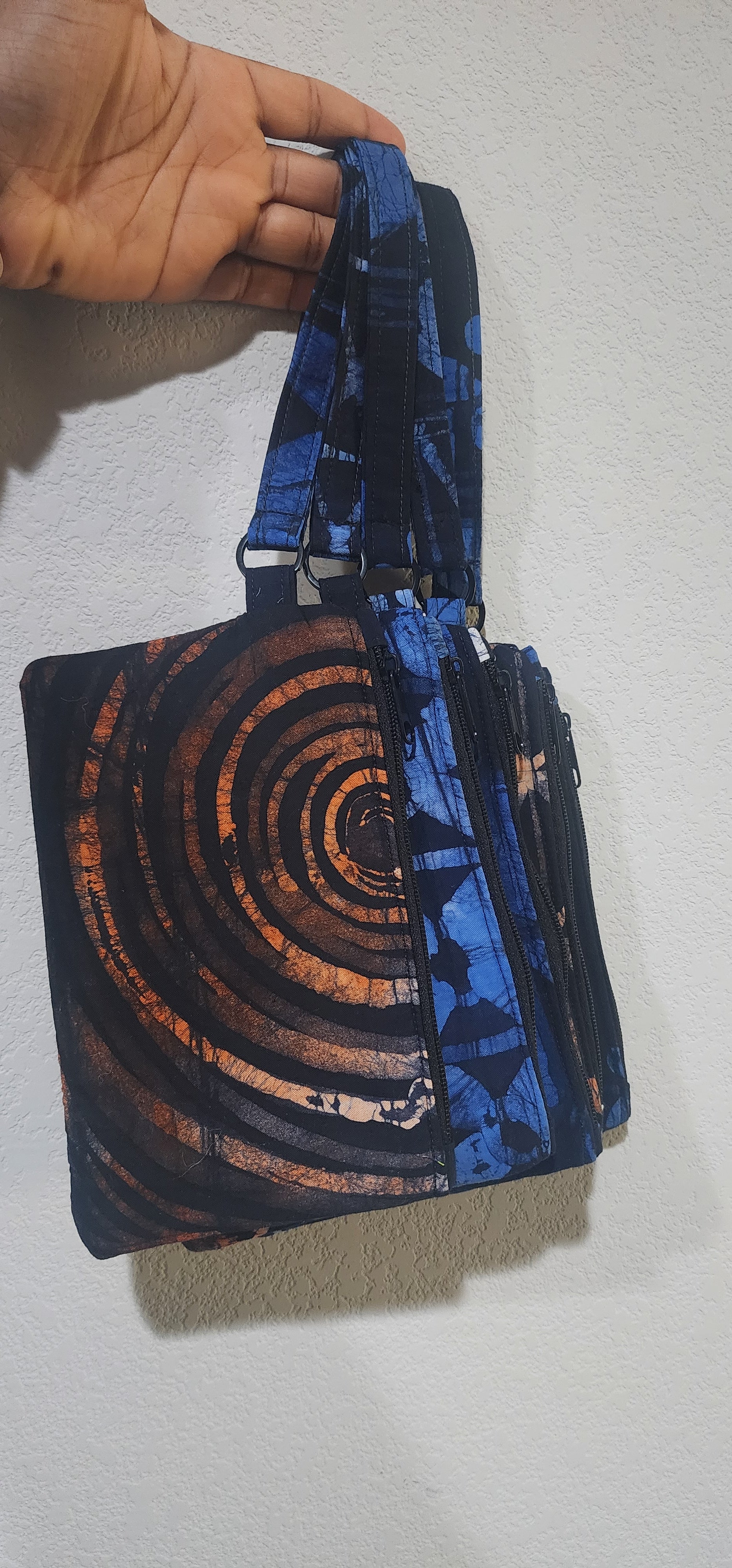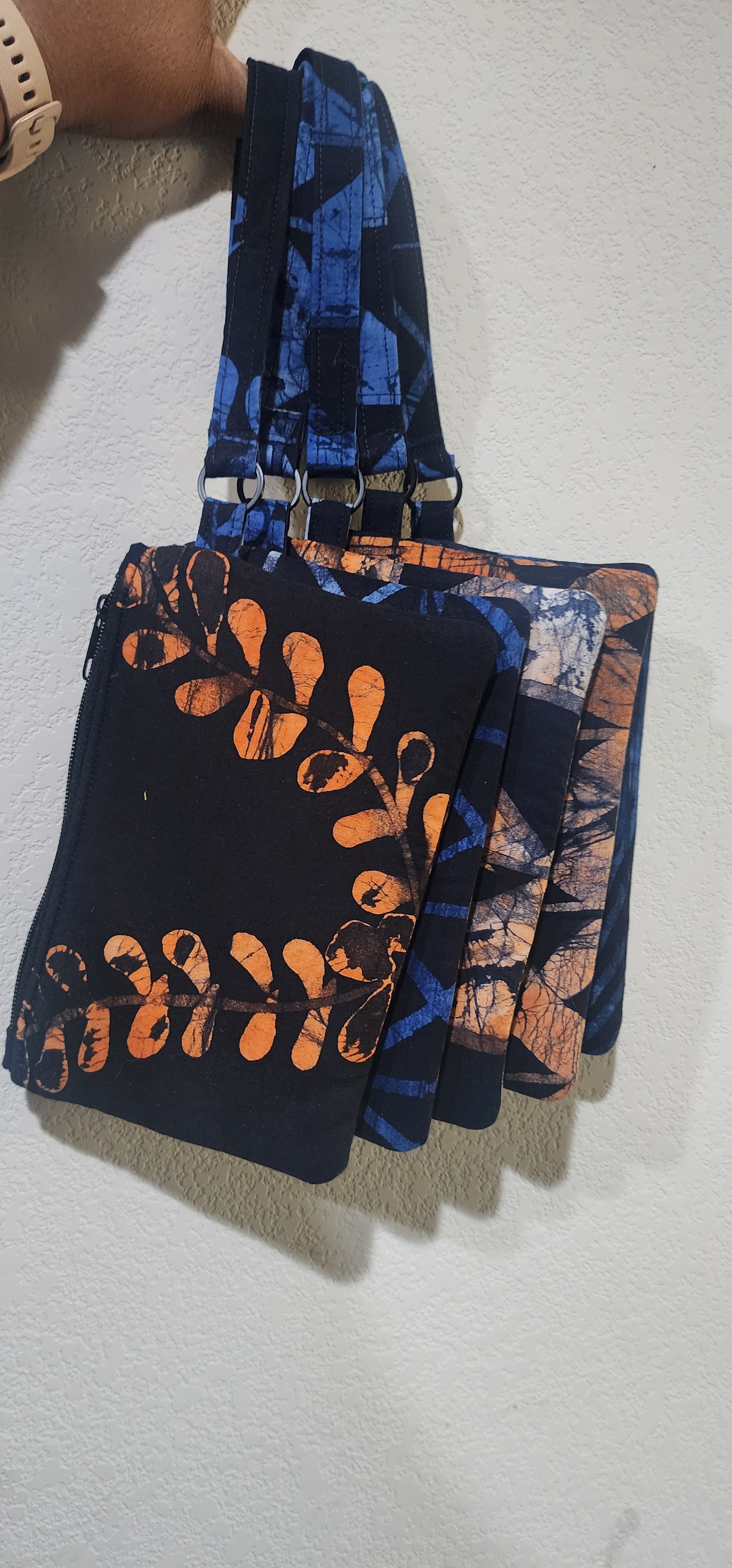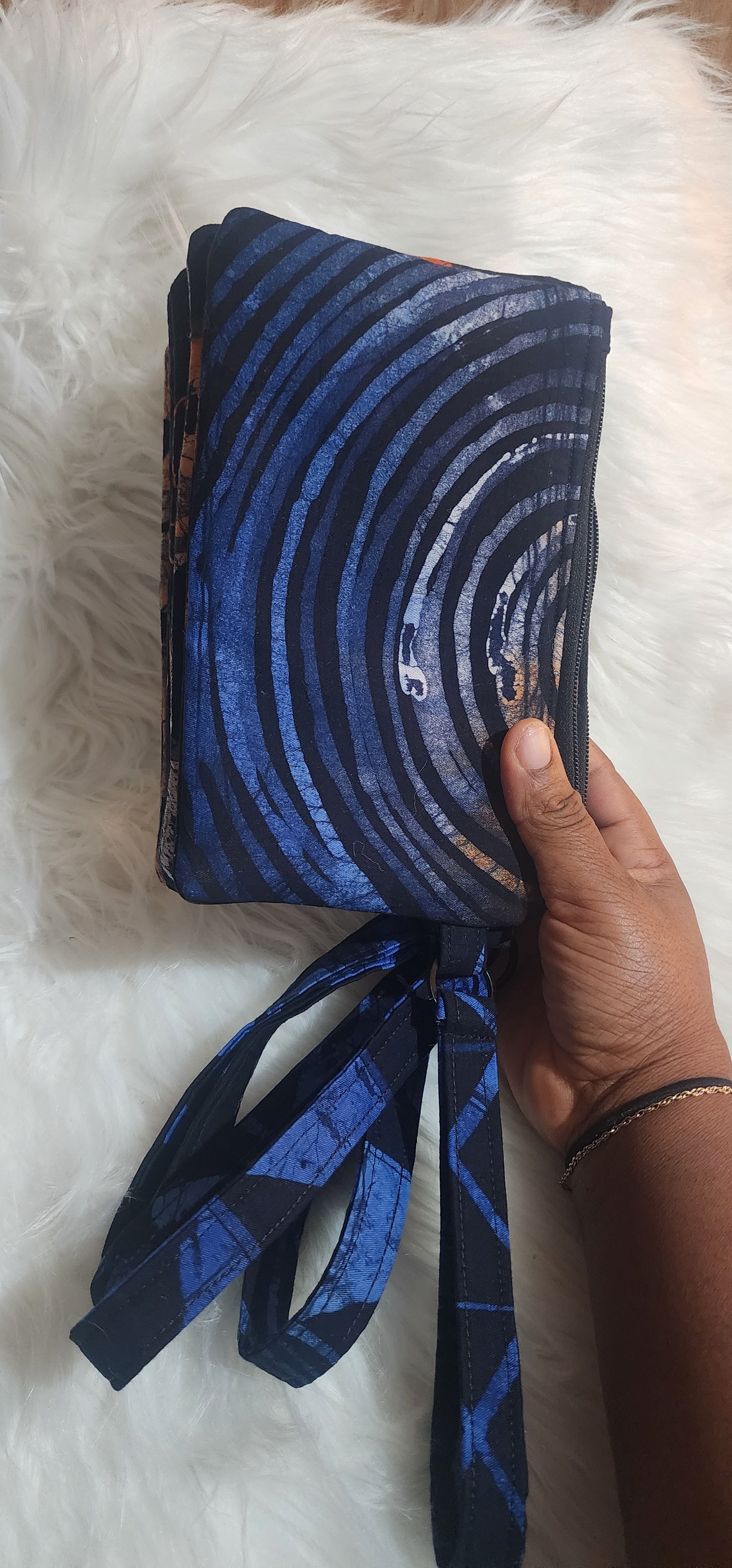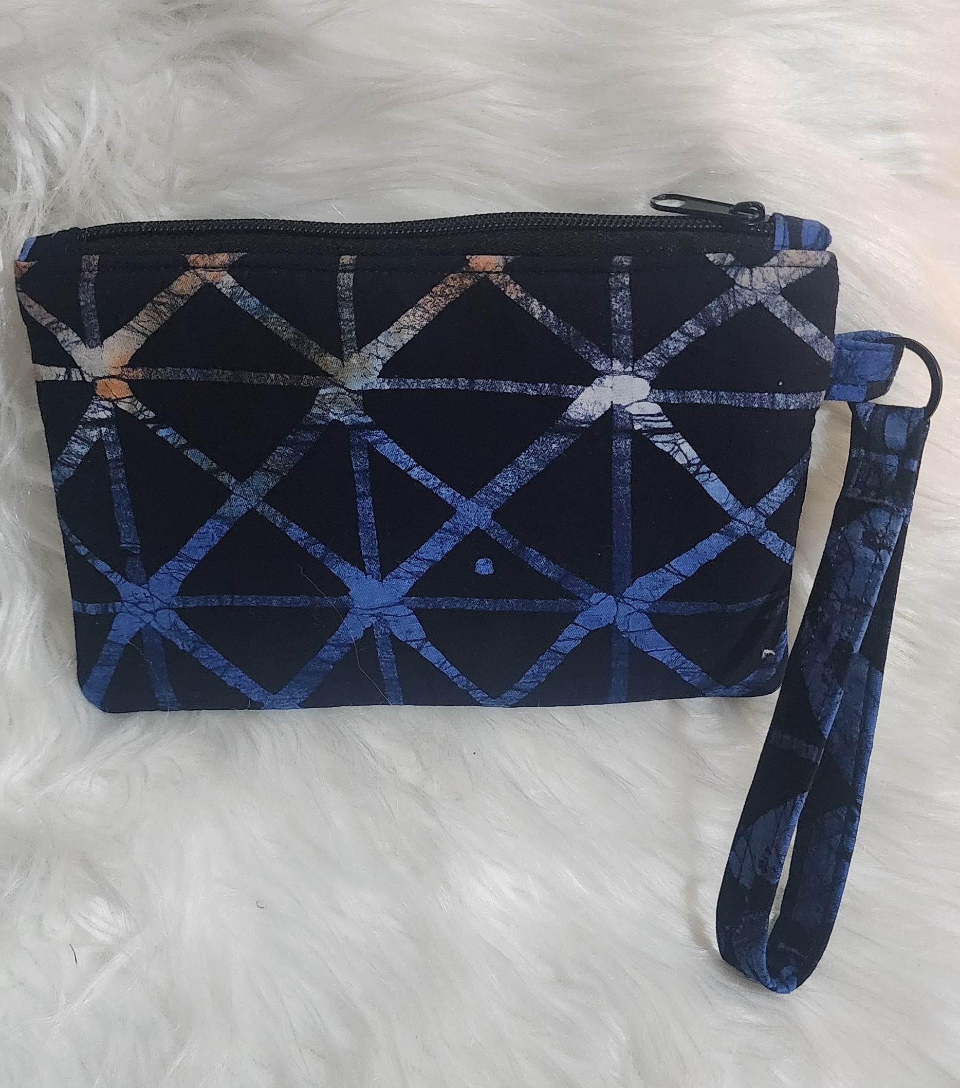 Handmade hand dyed adire batik wristlet in rich blue and orange tones. Lightweight, roomy, fully lined, and secured with zipper closure—perfect for carrying phone, cash, and essentials. A unique, culture-rich gift idea for the holidays.